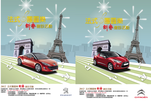 Bonne Année!又到歲末年終闔家團員之際,Peugeot / Citroen服務總代理 寶嘉聯合即日起至101年1月14日推出法式團圓樂新春健診服務活動,溫馨提醒Peugeot 及Citroen 車主朋友們,開心跨年迎曙光或農曆年節返鄉、出遊前,別忘了提前帶愛車回廠健診,讓愛車伴您開心迎接龍年到來。法式團圓樂活動期間除了可享免費健診服務外,亦提供正廠零件及鈑烤等多項優惠,回廠消費更可獲得獨家限量法式迎春好禮!