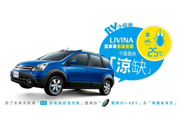 裕隆日產汽車自即日起隆重推出配備升級的「RV小玩咖」Nissan Livina,搭載著更完善的配備,將帶您再次恣意遊山玩水,體驗小玩咖的快樂本事。此次改款恆溫空調列為Livina全車系標準配備,並新增雙開式I-KEY、晶片防盜、頭尾燈停車自動關閉功能(註1),且增加「深海藍」新車色;售價新台幣55.9萬元起(註2)。