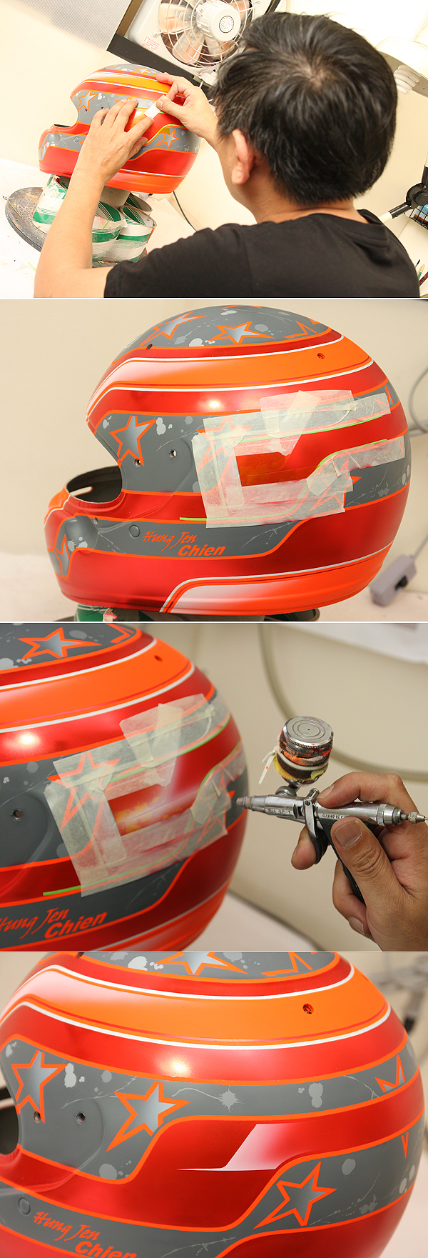 而訪談的最後,我們提到了接下來的發展,嚴曾海笑笑的表示,(其實)要先把架上每個帽袋的裡作品完成後再說,而目前他的規劃裡,從今年開始將花更多的時間在安全帽彩繪這個領域裡,雖然目前他的訂單還是以房車與Go Kart的安全帽為主(因為與機車用的安全帽比起來,房車帽多為無彩繪的素色),有機會他還是會希望有更多元的作品呈現出來,像是摩托車的安全帽等發展,不過在有騎士前來洽談之前,目前還是以房車帽在線條銳度的拿捏上,最讓嚴曾海樂於其中;而還是得回歸於「職人」對每一個手工細節的要求,時間能換取品質,要求完美才能讓安全帽上的每一道銳利線條更顯價值。