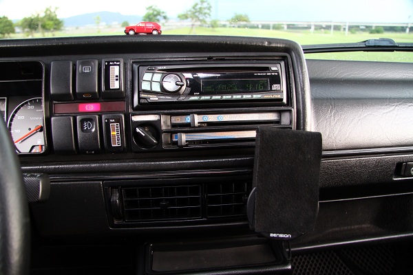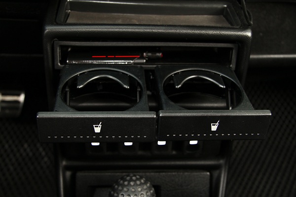 除了稀有的按鍵儀表之外,二代最被詬病的無杯架設計,車主也花了重金,購買了Lupo杯架與由知名改裝公司VW的Votex出品SWG翻模製作件的中控台套件,將兩者合一,然後重新切割原廠的中控台將原來的置物空間拆除,再換上SWG翻模製作類似Votex的中船改裝套件,這個套原先的規劃是要提供讓MK2的最上方原廠音響位置可以改裝三環賽車儀錶,然後把音響移到下方,再留一個置物空間!但是就被車主規劃成裝置Lupo杯架,也算是貼合日常生活的需求〈車主證實這個套件是跟英國的Awesome GTI網站訂來的〉!第二排就改成電動窗開關,而且還全車電動窗開關都裝一起,順便把開關的燈泡也都換成LED化了!