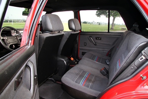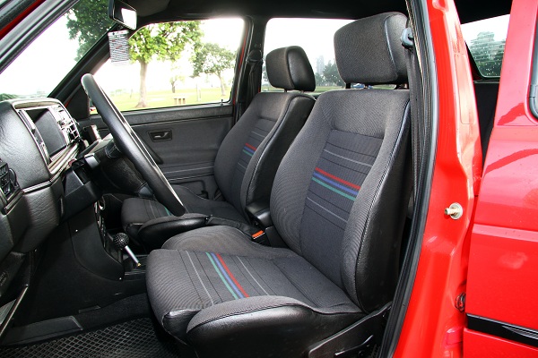 外觀巡禮完畢,接下來就是重頭戲的內裝!整老車的人都知道,內裝其實更麻煩,范小紅的內裝四座椅與門板,完全由日本購回,取自早期GT Special車款,其實GT Special與一般車型動力規格均相同,只有內裝不一樣,有點玩GTi接近的風格,原廠的GT Special就在C柱的位置有個GT Special字樣的貼紙,就這樣識別!花色就看圖片就知道了,也是條紋系列。而且座椅的品相很新,駕駛座還能調整高度,堪稱是另類原廠流用美品!
