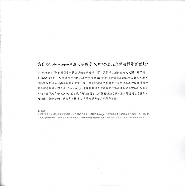 但是說了很多保養的觀念,其中要佈達一件去年底就知道的事情,就是VW車系台灣的保養週期,與歐洲同步,可以在15000公里時再保養,原先的是每7500公里進行保養即可,但是現在原廠宣布可以達15000公里〈或是12個月〉再行保養!