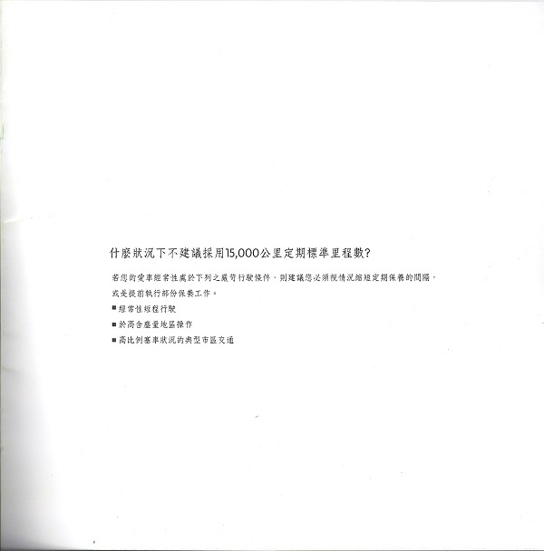 但是話說回來,愛車真的適合這樣的保養週期嗎?就在原廠的保養愛車說明手冊倒數第二頁有一個說明,就是什麼狀況下不建議採用15000公里定期標準里程數?