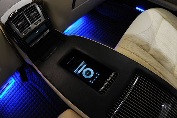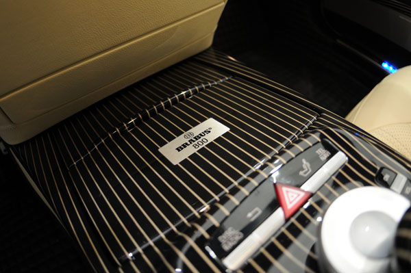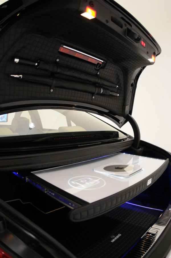 除了科技化「iBusiness 2.0」套件,BRABUS同時也利用藍色LED燈具於車內與行李廂中營造科技氛圍。座艙中也全面換裝質感更高的皮革包覆,飾板也改為類遊艇之橫條紋樣式,讓豪華感也跟著同步升級。