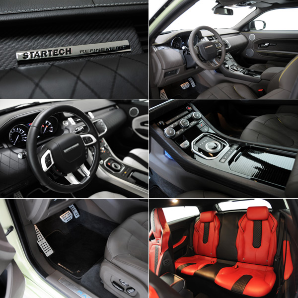 STARTECH Evoque於2011年杜拜車展首演的展示車,則呈現全真皮的內裝,每一吋的細節都要求完美,透氣、且觸感細緻的黑白皮革組合,更與鑽石菱紋的編織手法相輔相成。