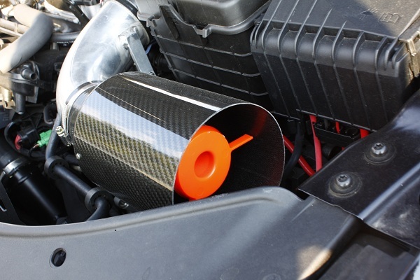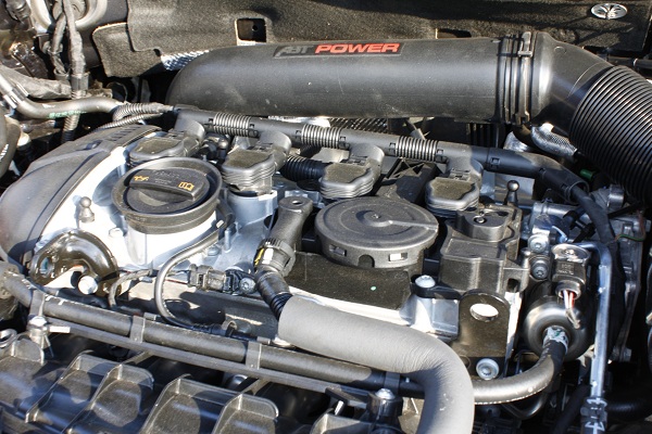 接下來Willy還拿下了引擎上方護蓋來增加散熱效果,並且改裝進氣裝置,採用的是以碳纖維包裝的渦流前端進氣口設計,VW車系相關的空氣流量感知器非常敏感,與節氣門的位置必須完全符合原廠設計的距離下,才不會出現故障碼,若是不注意感知器的位置任意移動,就會造成亮警告燈!Willy的改裝符合原廠的需求,因此一切正常無故障碼產生。
