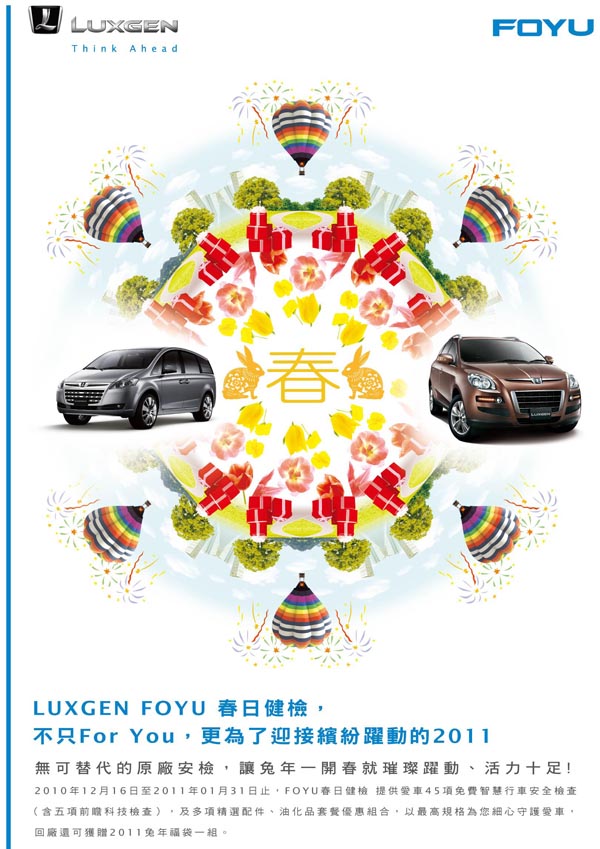 活動期間凡車主回廠健檢,可獲得一組含紅包袋和春聯的2011兔年福袋回廠禮外,還可享45項免費智慧行車安全檢查,包含健檢、洗車、車內外清潔…等,以及多項配件套餐,和內裝保養、機能件清洗等優惠套餐。此次Luxgen FOYU 春檢內容更加入Think+、Eagle View+、Side View+、Night View+和LDWS+等5項前瞻科技檢查服務,希望以原廠的檢測保養,提供車主最高規格的服務品質,讓車主和愛車以新春新氣象,迎接繽紛躍動的2011年。