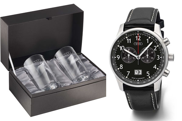 凡消費滿NT$15,000元,可獲得Audi精緻玻璃杯組乙份(左);凡消費滿新台幣60,000元,更可獲得Audi Collection原廠Chronograph Big Date高級手錶乙只(圖右,市價約新台幣16,000元)。