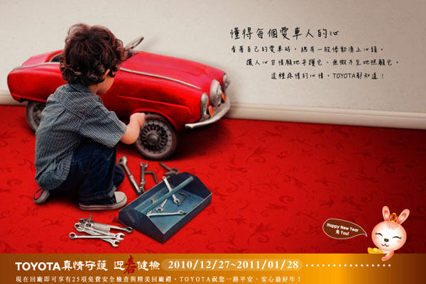 和泰汽車全台Toyota服務廠在活動期間提供25項免費安全健診,包括引擎、輪胎、雨刷、車體、煞車、車室及傳動系統等七大類,實施重點加強檢查以確保行車安全。活動期間內入廠健檢之車主,將獲贈精美紅包袋與春聯組,及YOKOHAMA輪胎全面88折優惠;入廠實施免費安全檢查同時使用定保套餐之車主,更可獲贈市價200元之「Toyota探索台灣之美桌曆」乙份(數量有限,送完為止)。活動期間另有雙層陶瓷隨行杯、粉彩保溫隨身瓶、Toyota流行潮包、暖毯與抱枕等Toyota紅利積點酬賓精品全新上市,供車主以現金價6折優惠購買。和泰汽車公司提醒全台Toyota車主,新春長假前別忘了事先安排愛車回廠健檢,保障愛車以最佳狀況上路,安心過好年。