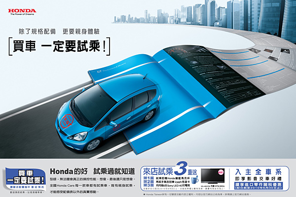全國Honda Cars亦從即日起展開三重好禮送活動,只要到各據點試乘車款,即獲贈Honda繽藍馬克杯及抽獎卡一張,更可試試手氣刮中最夯的超值好禮,還可再參加月月抽5台Sony 40吋LED電視,越早參加中獎機會越多,歡迎消費者到全台Honda Cars體驗試乘或上Honda Taiwnan官網〈http://www.honda-taiwan.com.tw/index.aspx〉查詢活動辦法。