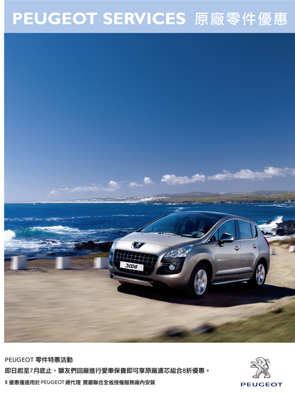 Peugeot總代理 寶嘉聯合建議您,為節省車主寶貴的時間,請多加利用服務廠的預約專線,事先安排服務時間,讓Peugeot全台服務團隊為車主提供最優質的服務。Peugeot售後服務團隊竭誠歡迎您的蒞臨,欲知活動詳情,請速洽全台Peugeot經銷商服務廠或透過網路www.Peugeot.com.tw、顧客服務專線0800-207-307與我們聯絡。
