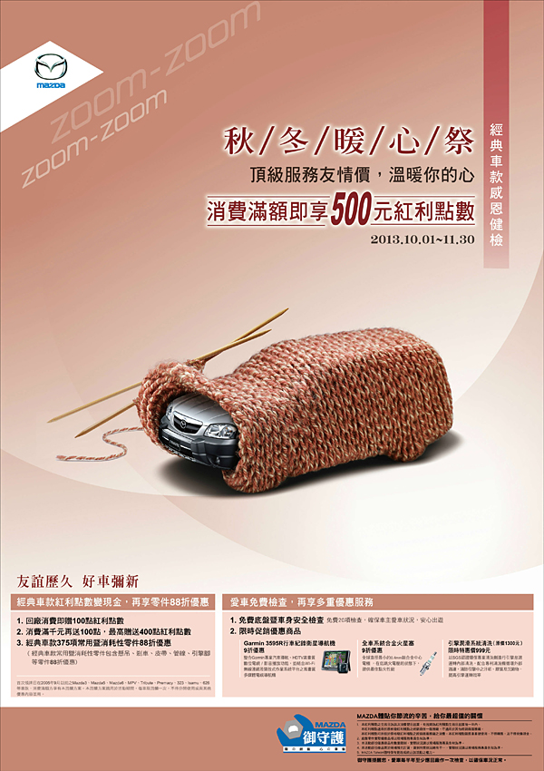本次「秋冬暖心祭」經典車款健檢服務,針對2005年9月前初次領牌之Mazda3、Mazda5、Mazda6、MPV、Tribute、Premacy、323、Isamu、626等車款,凡於2013年10月起至11月底活動期間內,預約回廠即可享「御守護」車輛免費健檢服務,回廠消費即贈紅利點數100點,消費滿千元再送100點,最高贈送400點紅利點數!