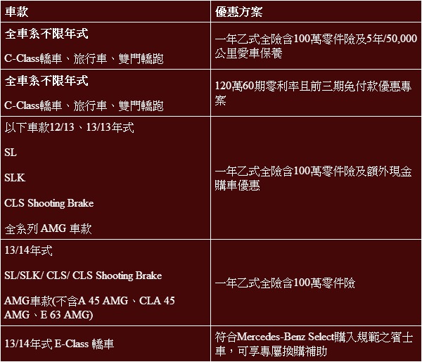 此外,選購13/14年之SLK/SL/CLS/CLS Shooting Brake,以及AMG系列車款(不包含A 45 AMG、CLA 45 AMG、E 63 AMG),凡在十月份完成交車、掛牌之客戶,享有1年乙式全險含100萬零件險,多樣化的購車選擇,釋放你心中的熱血靈魂!