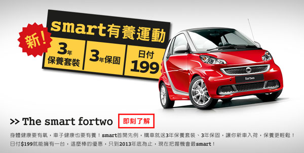 smart 出新招,有「養」運動開催!即日起至 2013 年底為止,只要日付199 元就能入主smart,再送 3 年/22,500公里保養套裝及3 年保固,讓準車主新車入荷,保養更輕鬆!