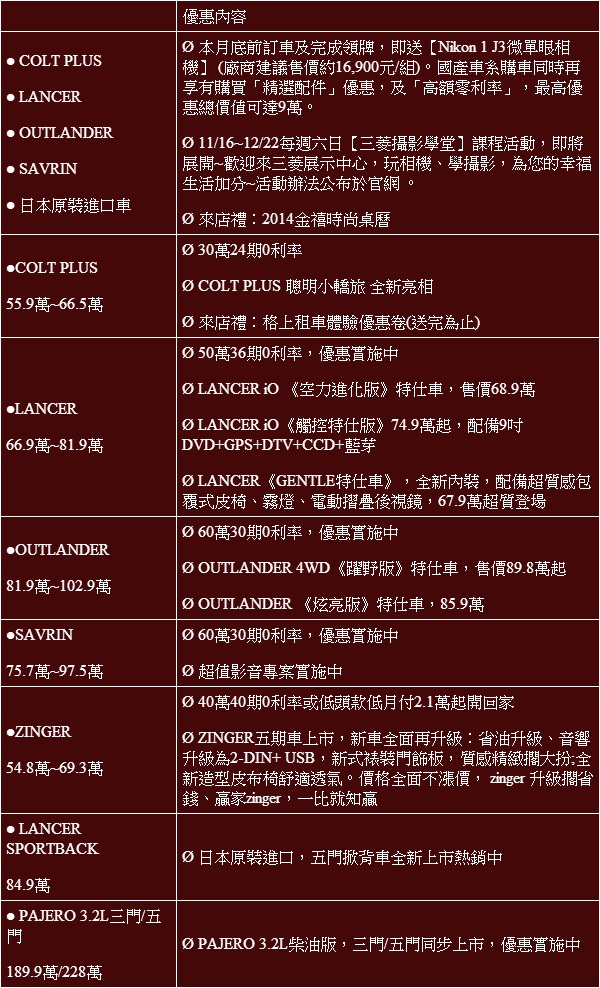 Mitsubish和車主最合拍!為搶攻年底購車潮,11月熱鬧推出「三菱最合拍」促銷活動,凡於月底前購買Outlander、Outlander iO、Colt Plus、Lancer Fortis、Lancer iO、Savrin、Zinger、Lancer Sportback及Pajero任一車款,並完成領牌手續,立即贈送 【Nikon 1 J3 微單眼相機】 (廠商建議售價約16,900元/組)。國產車系購車同時再享有購買「精選配件」優惠及「高額零利率」,最高可達9萬元優惠折扣。為歡喜迎接2014年,來店賞車再加送您「2014金禧時尚桌曆」,讓美麗的Mitsubish girl陪您快樂迎新年。