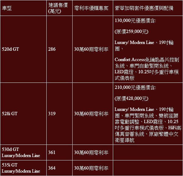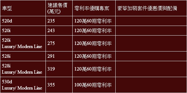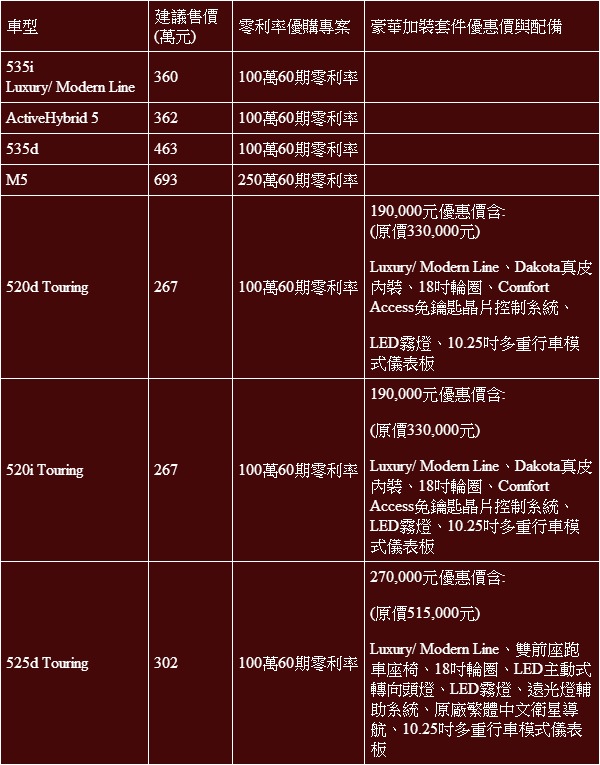 因為空前完整的產品實力,BMW Series Sedan、Gran Turismo與Touring於今年9月小改款上市至今,在台已創下接單450輛的熱銷狂潮,其中尤以四門房車超過350輛、較去年同期成長近20%的銷售數字最為亮眼,成功延續BMW 5系列在豪華中大型房車級距的領先地位,為慶賀如此佳績與回饋熱愛BMW的車迷朋友,BMW總代理汎德即日起針對全新BMW 5 Series Sedan、Gran Turismo、Touring、ActiveHybrid 5以及M5推出全車系60期零利率優購專案,並可享「豪華加裝套件優惠專案」,入主BMW 5 Series,現在就是不容錯過的最佳時機。