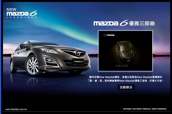 創意的行銷與令人目不轉睛的廣告一直是Mazda最為消費者津津樂道的特點,「New Mazda6優雅三部曲」活動讓消費者親身感受New Mazda6點、線、面傑出優異的全面性。Mazda為了幫助消費者輕鬆拿好康特別提供奪獎小撇步;首先請登入www.mazda6.com.tw至活動頁面;只要您於網路完成New Mazda6最優雅的「點、線、面」票選,就有機會獲得台北晶華酒店住宿券抽獎。接著當您票選完成即可獲得「New Mazda6優雅兌換券」,下載列印後,憑券至全台展示間兌換抽獎券,即可參加台北晶華酒店下午茶券抽獎。完成以上二部曲,只要消費者至展示間試駕New Mazda6,完成後還可參與『御駕賞』抽獎活動,有機會獲得三部曲最大優惠「6萬元購車基金」。