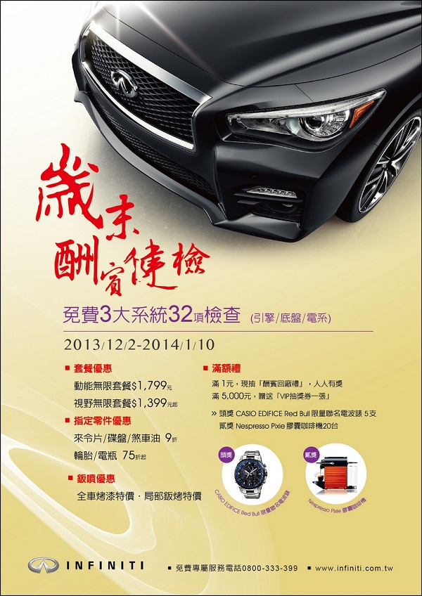 Infiniti 歲末酬賓健檢活動期間,除了提供三大系統32項免費檢查(註1),更提供全車系「動能無限套餐」及「視野無限套餐」兩項超值保養套餐(註2),以及來令片、碟盤9折,電瓶、輪胎75折起酬賓優惠。此外,當日單筆消費滿新台幣1元(含)以上者,即可抽酬賓回廠禮,人人有獎,當日單筆消費滿新台幣5,000元(含)以上者,更有機會抽中CASIO Infiniti Red Bull Racing限量聯名電波錶及Nespresso Pixie膠囊咖啡機。