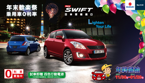 來自日本品牌的Suzuki,特別針對旗下超人氣乘用車款包含Swift、SX4、Grand Vitara JP、Jimny與Alto,推出購車0利率限時優惠,陪您一起度過熱鬧的年末歡樂時光,並迎接充滿希望的未來!同時Suzuki更貼心提醒您,Suzuki年終健檢活動即將於2013/11/30-2014/1/29起跑,記得為愛車做好完善的車況檢查,才能安全守護每一趟出遊時光!而在即將到來的2014年台北車展當中,Suzuki除了展示旗下熱門車款外,更將首次於台灣公開亮相一款令人驚豔的全新概念車,敬請拭目以待!