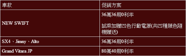 2.本促銷專案活動,限Swift GLX/GL、SX4、Grand Vitara JP、Jimny、Alto車款為主。
