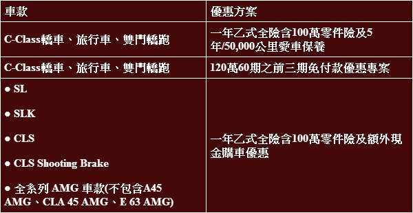 台灣賓士一月份針對旗下性能車款推出限時購車優惠!凡入主SLK、SL、CLS、CLS Shooting Brake及所有AMG系列車款(不包含A 45 AMG、CLA 45 AMG、E 63 AMG),凡在一月份完成交車、掛牌之客戶,享有1年乙式全險含100萬零件險及額外現金購車優惠。