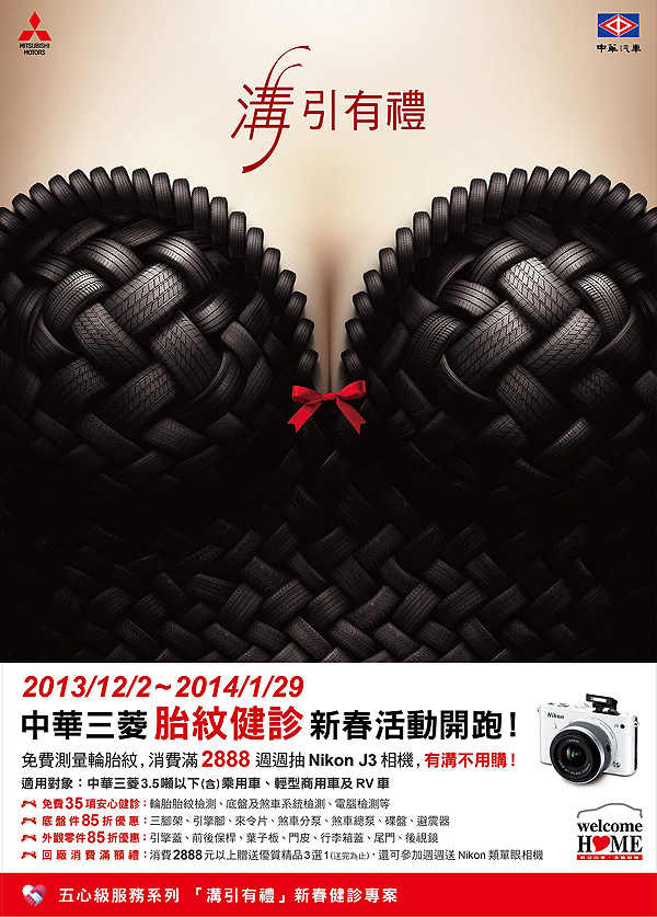 為了維護您的行車安全,自即日起至1月29日止,中華三菱推出「溝引有禮」新春健診活動,針對進廠車輛,優先以專業胎紋檢測器為您量測胎紋,並提供車輛五油三水、煞車、底盤等35項免費安心健診,還有底盤及外觀零件85折優惠,回廠消費滿2,888元,就可以獲贈精美好禮三選一(送完為止),還有機會抽中NIKON J3類單眼相機!
