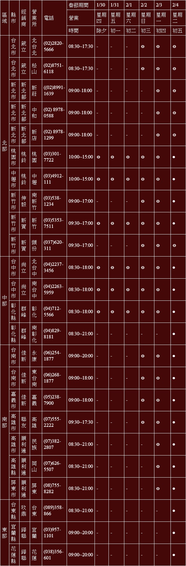 打 ◎ 者,表示該營業所/服務廠當日有人員值班