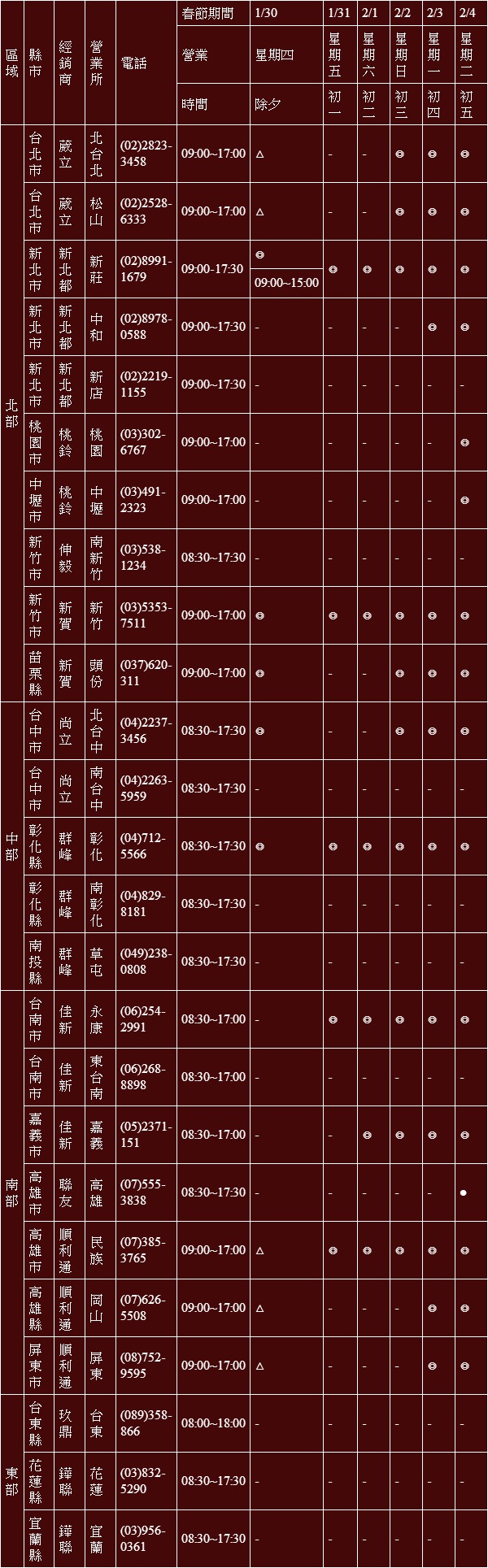 打 ● 者,表示該營業所/服務廠正常營業