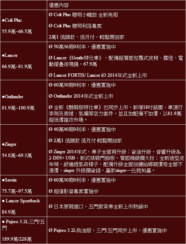 Mitsubishi 2014年式新車全新上市,為打造Lancer車主優雅的個人特質,量身推出Lancer《Gentle特仕車》,新增包覆式皮椅、霧燈、電動摺疊後視鏡等超值配備,並以67.9萬之優惠價格犒賞車主。而Outlander全新《酷裝版特仕車》配備更吸睛,大方新增 18吋鋁圈、車頂行李架及側裙、氣壩等空力套件,並以81.9萬超低價搶攻市場,來買車就能現賺優惠。