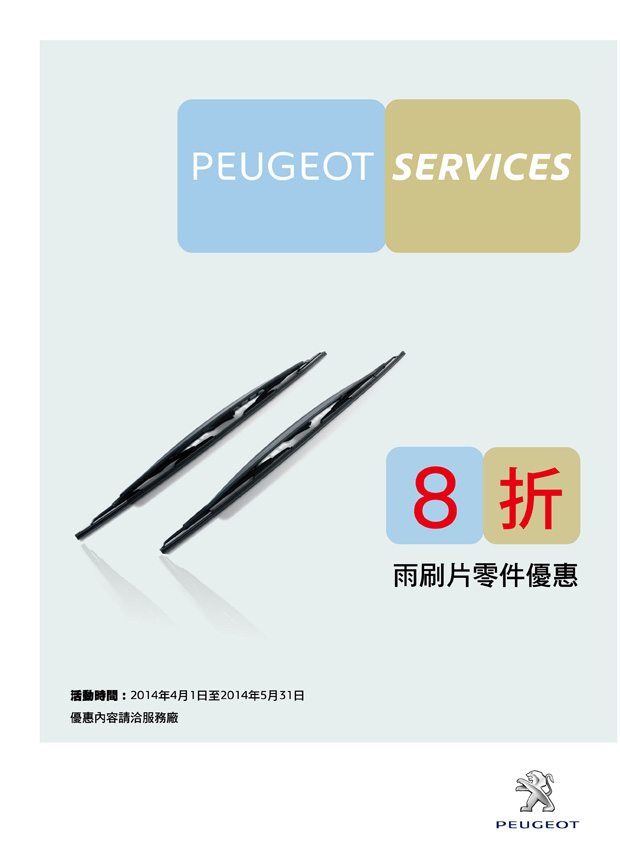 2014 Peugeot Services原廠零件優惠活動第一波 ─ 原廠雨刷片系列零件,自即日起至5月31日活動期間回廠即享原廠雨刷片系列零件8折優惠價格,讓您擁有一個清晰的視野及安全的行車環境。
