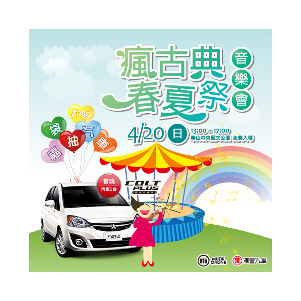 玩膩了春吶及海洋音樂季嗎?今年有數位音樂MUZIK ONLINE業者特別舉辦不同的音樂祭,4/20(日)邀請民眾在華山藝文中心的中央藝文公園,享受古典樂的盛典;除了免費入場之外,現場也有多樣的樂隊演奏,其中買「音樂福袋送愛」活動,首獎送出市價66.5萬的Colt Plus頂級旗艦型,讓民眾開新車聽古典音樂,享受高IQ科技體驗,期待你們機會成為Colt Plus的超幸運車主喔! 現場匯豐汽車攤位亦可賞新車,擲杯還送媽祖小公仔,加入「匯豐汽車30888」粉絲團活動就可以獲得Colt Plus模型車,匯豐汽車邀請大家一起來感受Colt Plus與古典音樂所創造的熱情活力。
