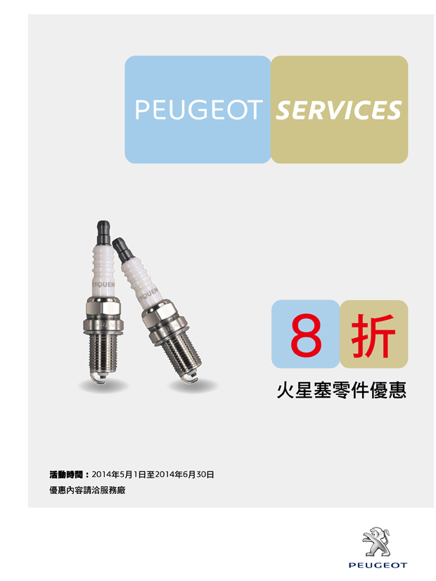 Peugeot Services原廠零件優惠活動熱情實施中,5-6月火星塞及多項電氣系統零件8折優惠,歡迎車主們把握優惠活動期間至全台Peugeot服務廠由專業技師提供診斷建議。Peugeot Services原廠零件優惠活動詳情,請洽詢全台Peugeot經銷商授權服務廠。