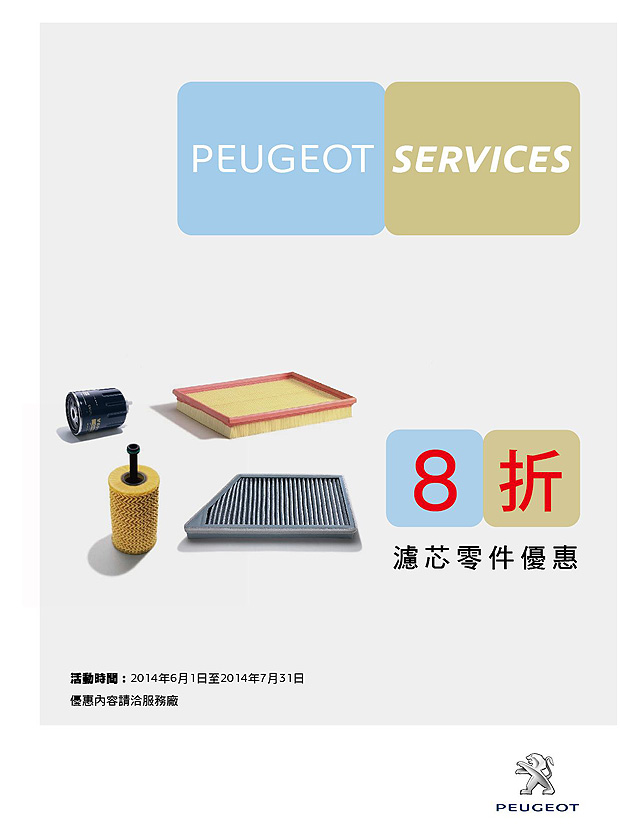 除此之外,Peugeot Services原廠零件優惠活動6~7月同步推出四芯特惠,包含粉塵濾芯、空氣濾芯、機油濾芯、燃油濾芯零件享8折優惠,全面提昇車內空氣品質及引擎動力淨化再升級,讓您在今夏不僅有清涼的冷氣系統外,更擁有潔淨空氣,讓您與最愛的家人共享輕鬆愉悅又健康的夏日行車時光。