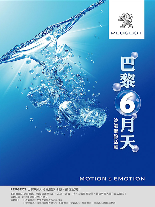 Peugeot巴黎6月天冷氣健診服務活動於6月3日起至7月31日止於全台服務廠展開清、淨、涼的巴黎6月天冷氣健診活動,為節省您的寶貴時間,提醒車主們多加利用所屬服務廠預約專線,事先安排服務時間,寶嘉聯合竭誠歡迎您的蒞臨,活動詳情請參閱www.peugeot.com.tw網站及各地經銷商服務廠服務專線,或請上網Peugeot Taiwan Facebook粉絲團粉絲團隨時掌握最新消息。