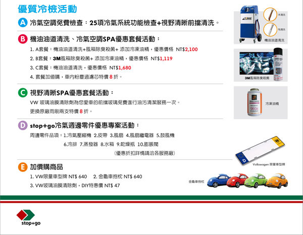 “VW 限量車型牌”、“金龜車抱枕”、“VW 玻璃油膜清除劑 ”等,詳洽各服務據點