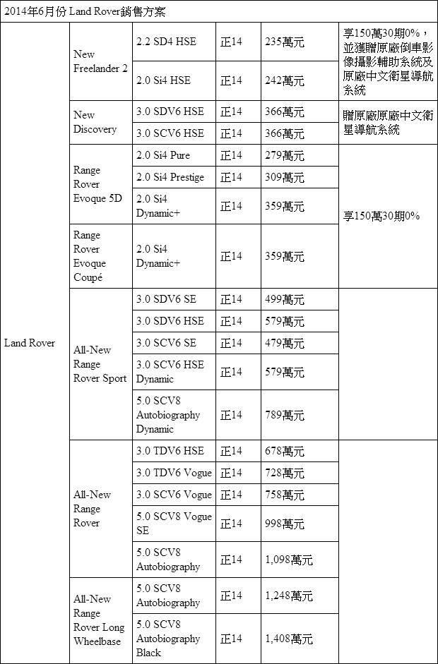 而搭配6月份銷售方案,凡6月底前交車,New Freelander 2車主即享專屬150萬30期0%利率貸款,再加贈原廠倒車影像攝影輔助系統及原廠中文衛星導航系統;New Discovery致贈原廠中文衛星導航系統;旗下時尚跑旅Range Rover Evoque全車系則可享專屬150萬30期0%利率貸款,給予Land Rover車主最完整的理財規劃和尊榮禮遇,期望再創銷售佳績,以源源不絕的成長力道,展現頂級SUV第一品牌的王者氣勢。