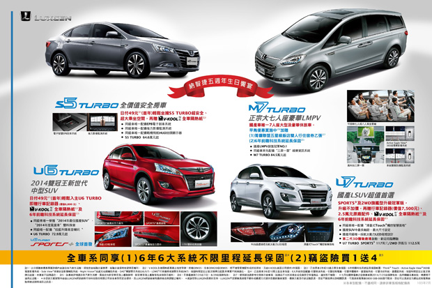 現在選購全價值安全房車S5 Turbo,贈送抗暑利器V-Kool隔熱紙全車裝貼外(7),更擁有好禮二選一優惠專案!優惠一:購車即贈行車紀錄器、炫目日行燈與價值2萬元的原廠配件(6),或者可選擇優惠二:60萬24期0利率或首年日付49元分期專案(4),交車皆享有前瞻系統6年不限里程延長保固(5)、6大系統6年不限里程延長保固(2)及新安竊盜險買一送四專案(3)。輕鬆入手國產中型房車首選!欲知各車系優惠詳情請上官網:http://www.Luxgen-motor.com.tw/Event