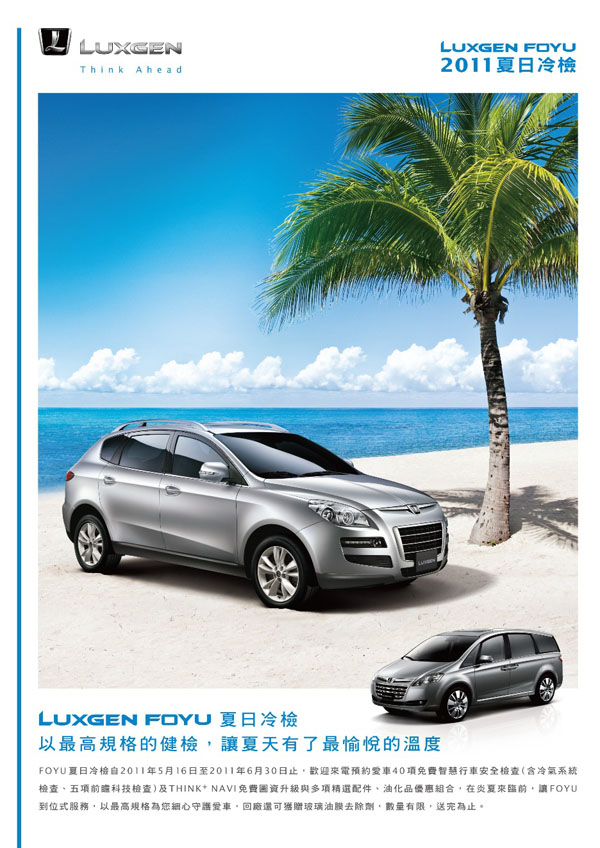 Luxgen為提供全省車主更全面、更在地的服務,全省擴點計劃正如火如荼展開,預計從現行的31個據點拓展至38個據點,要以更貼近需求的Luxgen FOYU服務為車主預先設想,以回饋車主們的信賴及支持;而隨著炎夏腳步的逼近,請即為您的愛車預約「Luxgen FOYU夏檢」,讓Luxgen原廠的專業健檢為您的愛車服務。若欲知更多夏檢訊息,請洽Luxgen客服專線:0800-588-088,為愛車預約回廠保養。