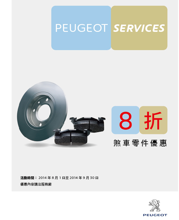 Peugeot Services原廠零件優惠活動自即日起至9月底止推出煞車零件8折優惠,體驗Peugeot優異操控性能,同時享有安全保障。