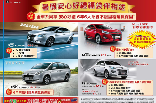 U6 Turbo Sports+成功延續U6 Turbo國產SUV銷售冠軍氣勢!時序進入更加炎熱的八月,Luxgen為了感謝消費者支持,讓車主盡情享受熱辣的夏日假期,於農曆吉祥月推出全車系超值優惠專案(1)及安心好禮福袋伴相送活動,交車即贈送平安福袋,祝福車主們行車歡喜平安。