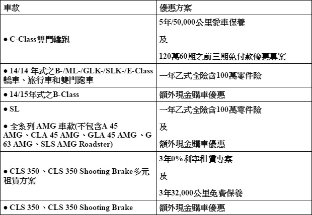 台灣賓士九月份推出熱門限定車款購車優惠方案,凡購買14/14 年式之B-/ML-/GLK-/SLK-/E-Class轎車、旅行車和雙門跑車,並在九月份完成交車、掛牌者,即享有一年乙式全險含100萬零件險,讓您輕鬆入主夢寐以求的夢想車款,如此豐富的車款選擇與專屬優惠,趕緊至全省賓士展示中心賞車!