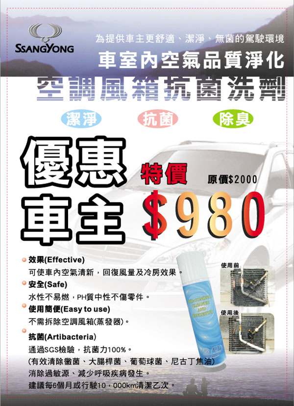 三、空氣品質淨化專案:原價2,000元的「空氣品質淨化專案」於活動期間優惠價僅980元,透過獨家空調風箱抗菌清洗工程,將沉積在空調系統中不易清除的灰塵汙垢、尼古丁、黴菌源、過敏原,徹底清潔同時除菌除臭,為您與家人重新打造清爽潔淨的車室空氣。