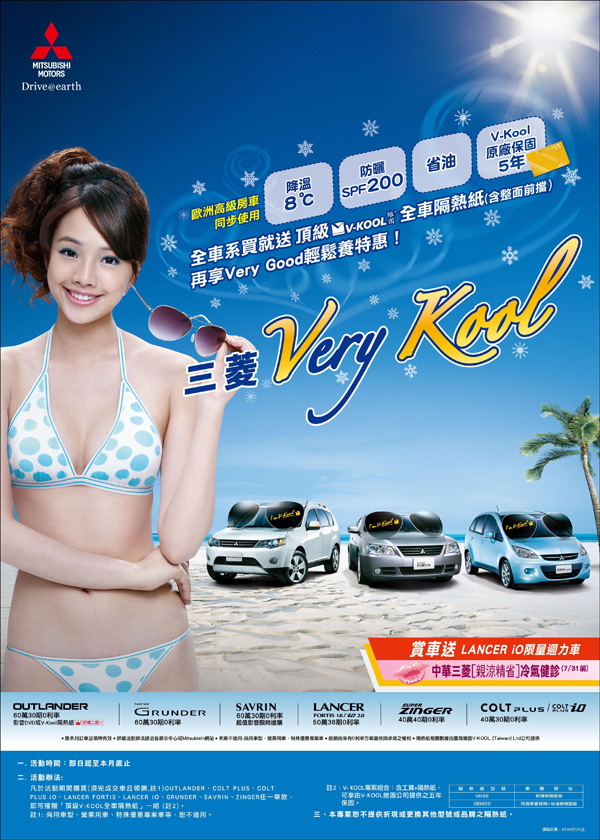 想要讓愛車更清涼,除了V-KOOL隔熱紙之外,也歡迎即日起至中華三菱全台服務廠,「親涼精省」33項免費冷氣健診專案進行至7月底;而為回饋所有愛護Mitsubishi的車主,中華三菱也持續推出VERY GOOD輕鬆養專案,保固期間內正常回廠保養的車輛,於期滿後可享維修零件最低8折的優惠,讓車主兼顧保養愛車又省荷包!詳細方案內容請洽中華三菱全台服務廠。