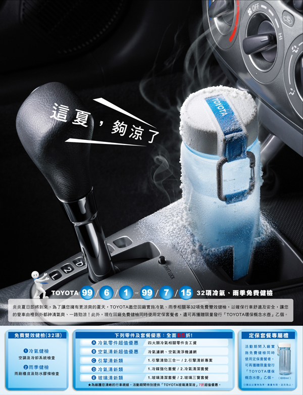 和泰汽車全台Toyota服務廠,在活動期間提供32項免費冷氣及雨季雙效健診,包括冷氣出風狀況、風速、冷度、鼓風機作動、主/副水箱液、冷卻液、冷卻系統、冷凝器、壓縮機,以及雨刷、車窗及天窗防水膠條檢查、車門及行李箱防水膠條檢查等,確保車輛不論在晴、雨天候,相關機件均正常運作。考量車主更換正廠零件的需求,和泰汽車針對四項冷氣相關零件,包括儲液罐、膨脹閥、蒸發器、冷凝器,均給予85折優惠,Toyota玻璃清潔液更有7折優惠。若車主實施維修保養,亦可享「引擎清勁三合一」、「引擎清新專案」、「冷煤強化套餐」、「冷氣清潔套餐」、「玻璃清潔套餐」、「玻璃三寶套餐」等85折。藉由多樣化的貼心優惠,讓車主可依實際需要選擇適合自己愛車的套餐,也讓車主感受來自Toyota的關懷。