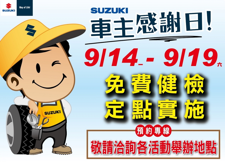 活動期間除健檢服務外,TAIWAN SUZUKI貼心的為參加健診的SUZUKI車友們準備SUZUKI精美的贈品,數量有限送完為止,動作要快喔!