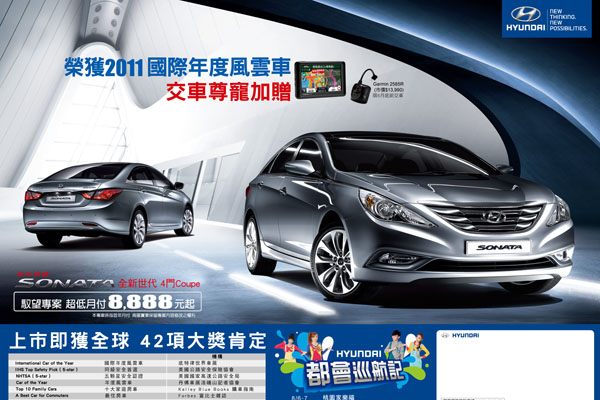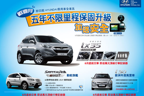 於此,總代理為慶賀雙喜臨門,祭出了大回饋給消費者。推出了乘用車全車系(含進口車),全面升級「五年不限里程延長保固」。此外,甫上市Hyundai跑格旗艦 Sonata除推出超低月付專案之外,交車還送Garmin三合一GPS(行車記錄+數位電視+GPS導航)。