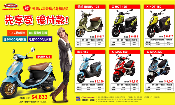 慶祝PGO連續八年榮獲台灣精品獎,PGO特別推出「先享受 後付款」專案,即日起至99年6月30日止,購買PGO全車系任一款,皆可享有12期0利率的購車優惠貸款,此外前3個月還免付款〈4月購車,7月2日再付第一期款;5月購車,8月2日再付第一期款;6月購車,9月2日再付第一期款〉,更加贈新台幣30000元失竊險及30000元火險。不僅如此,全系車款者更可享有0頭款優惠,讓消費者真正體驗「先享受、後付款」的超級VIP禮遇。