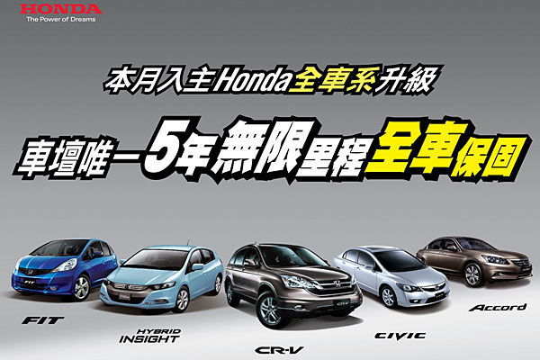 本月底前領牌車主,Honda Taiwan贈送新車延長保固專案,全車系由「三年或十萬公里保固」升級「五年無限里程全車保固」,不限行駛里程、不限重點項目,Honda原廠全車保固承諾,堪稱是國內史上最優保固服務,搭配各項優惠,盡享最高禮遇。以下提供全車系優惠內容:年度環保休旅車CR-V,本月推出限量Modulo特仕版,換裝超值原廠Modulo套件外觀,增添個性式樣;經典旗艦Accord,以大器風範彰顯卓越品味人生,入主加贈NAVI行車專用衛星導航;都會時尚CIVIC及兼具環保與豐富駕駛樂趣的INSIGHT Hybrid油電車款,即享車用DVD影音系統,行車娛樂滿載隨行。