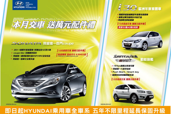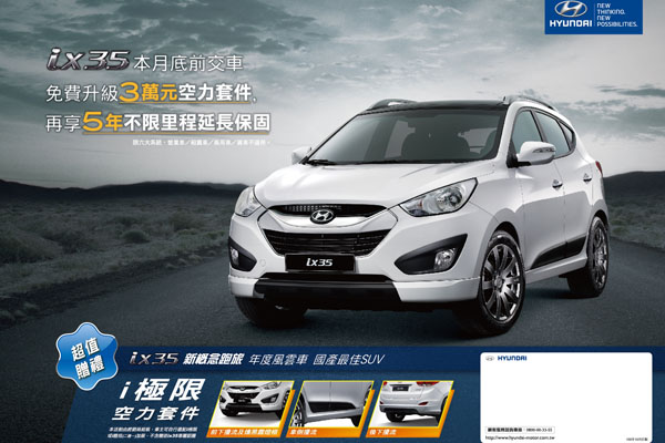 於此,總代理南陽實業為慶賀Hyundai喜事連連,推出了大回饋給消費者。包含了乘用車全車系(含進口車),全面升級「五年不限里程延長保固」、年度風雲車新概念跑旅ix35交車就送價市值30,000元i極限特仕空力套件 (前下擾流及燻黑霧燈框、車側擾流、後下擾流)。