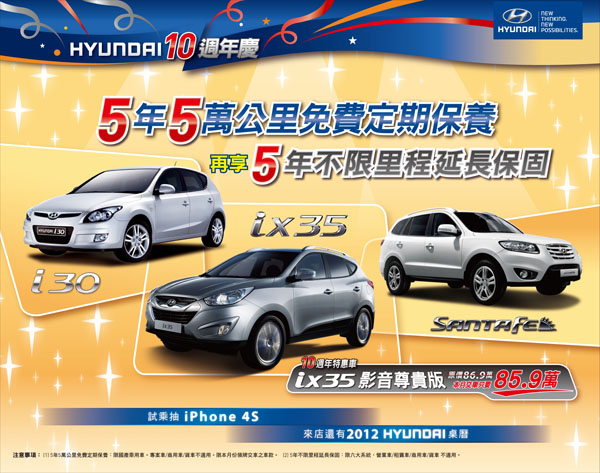 總代理南陽實業在此時,為歡慶與Hyundai品牌合作今年邁入第十年,除原本的延長保固專案之外,在12月領牌交車之乘用車,再享「5年5萬公里免費定期保養」專案,以回饋喜愛Hyundai的消費者。並且來店試乘還可以獲贈精美的2012年Hyundai桌曆,並有機會抽到最流行的iPhone 4S手機。